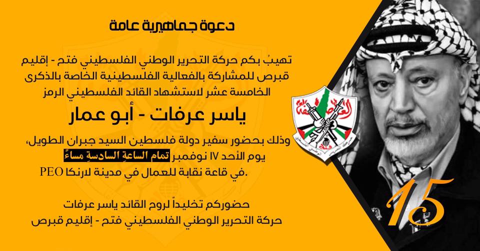 تهيبُ بكم حركة التحرير الوطني الفلسطيني فتح – إقليم قبرص للمشاركة بالفعالية الفلسطينية الخاصة بالذكرى الخامسة عشر لاستشهاد القائد الفلسطيني الرمز ياسر عرفات، وذلك بحضور سفير دولة فلسطين السيد جبران الطويل، وذلك يوم الأحد 17 نوفمبر الساعة السادسة والنصف مساءً في قاعة نقابة للعمال في مدينة لارنكا.