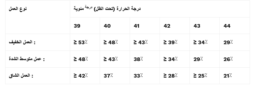 وفقًا للقانون ، عندما تكون درجة الحرارة بين 39 درجة مئوية و 44 درجة مئوية ، إذا تجاوزت مستويات الرطوبة النسبية حدًا معينًا ، يجب أن يتوقف نشاط العمل. تعتمد هذه المستويات على نوع العمل: