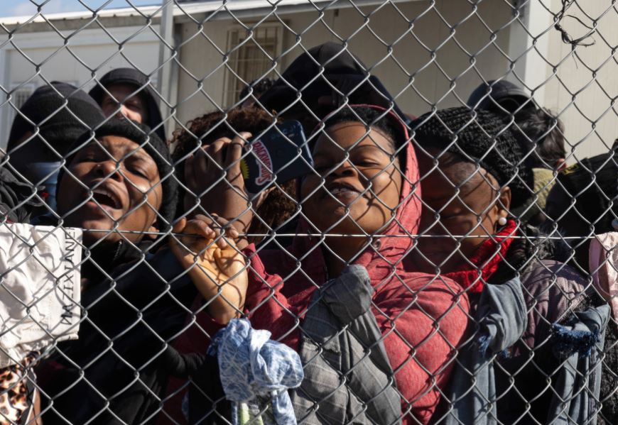 هتاف المهاجرين والتلويح بهم تحدثوا إلى الرئيس من خلال سياج من الأسلاك.