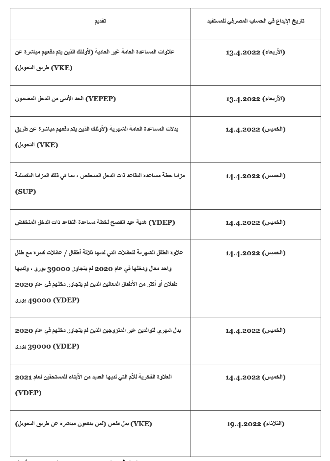 سيتم إرسال مخصصات المساعدة العامة الشهرية (YKE) إلى المستفيدين بتاريخ 14.4.2022 مع تاريخ الاسترداد 18.4.2022.