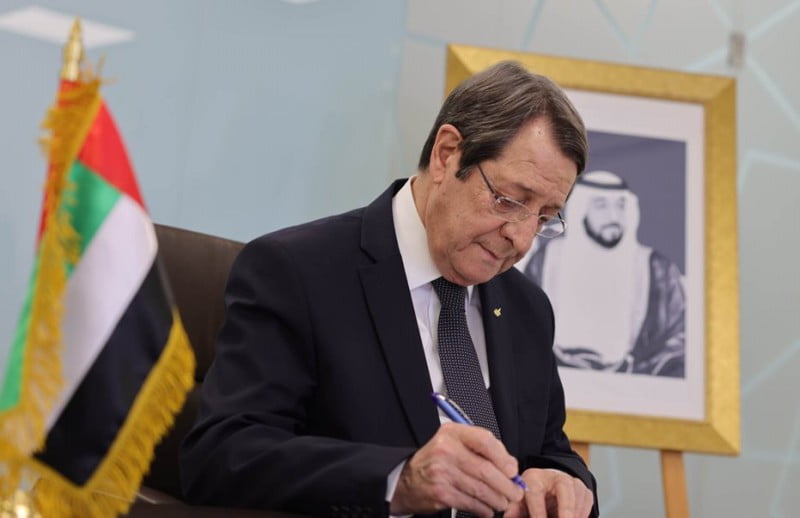 وقع رئيس الدولة أناستاسيادس كتاب التعازي الذي افتتح في سفارة دولة الإمارات العربية المتحدة في وفاة رئيس الدولة وأمير أبوظبي الشيخ خليفة بن زايد آل نهيان.