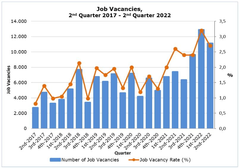 في الربع الأول من هذا العام ، كان هناك 12874 وظيفة شاغرة في قبرص (13.7٪ أكثر).