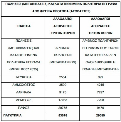 بلغت وثائق البيع التي تم تقديمها إلى سجل الأراضي ولم يتم الانتهاء من نقل البيع 29.1 ألفًا، منها 9.5 ألف في بافوس، و7.3 ألف في لارنكا، و7.2 ألف في ليماسول، و4.2 ألف في فاماغوستا، و0.9 ألف في نيقوسيا.