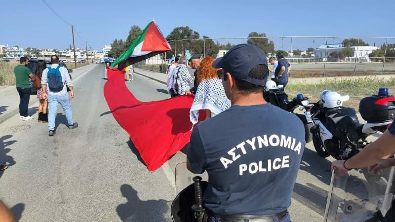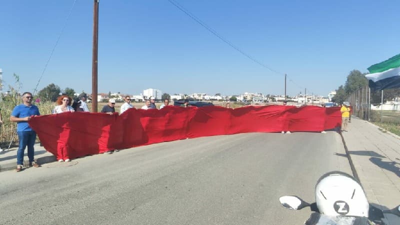 فرش المتظاهرون قطعة قماش حمراء ترمز إلى دماء غزة، ورددوا شعارات مثل “الحرية لفلسطين” و”التضامن القبرصي الفلسطيني”.