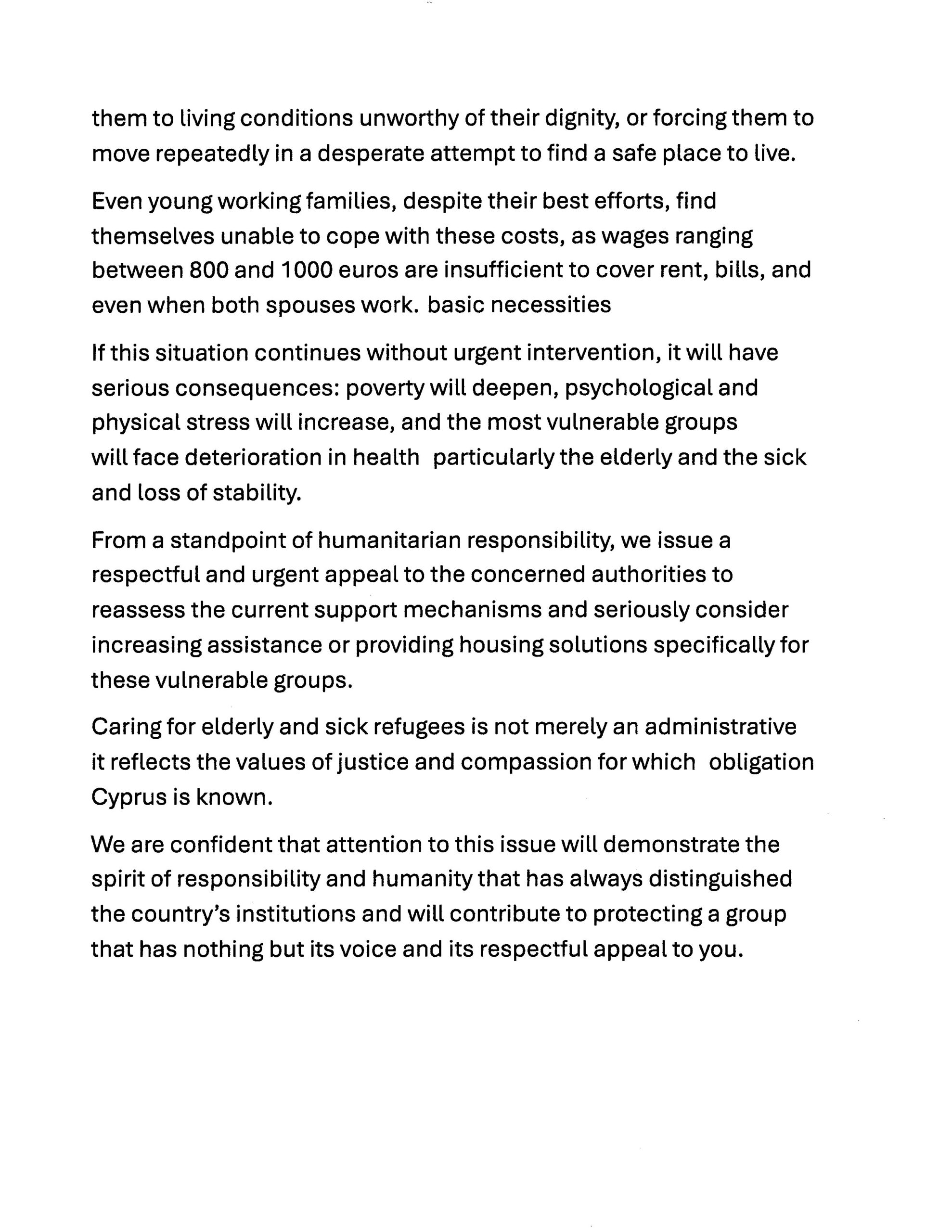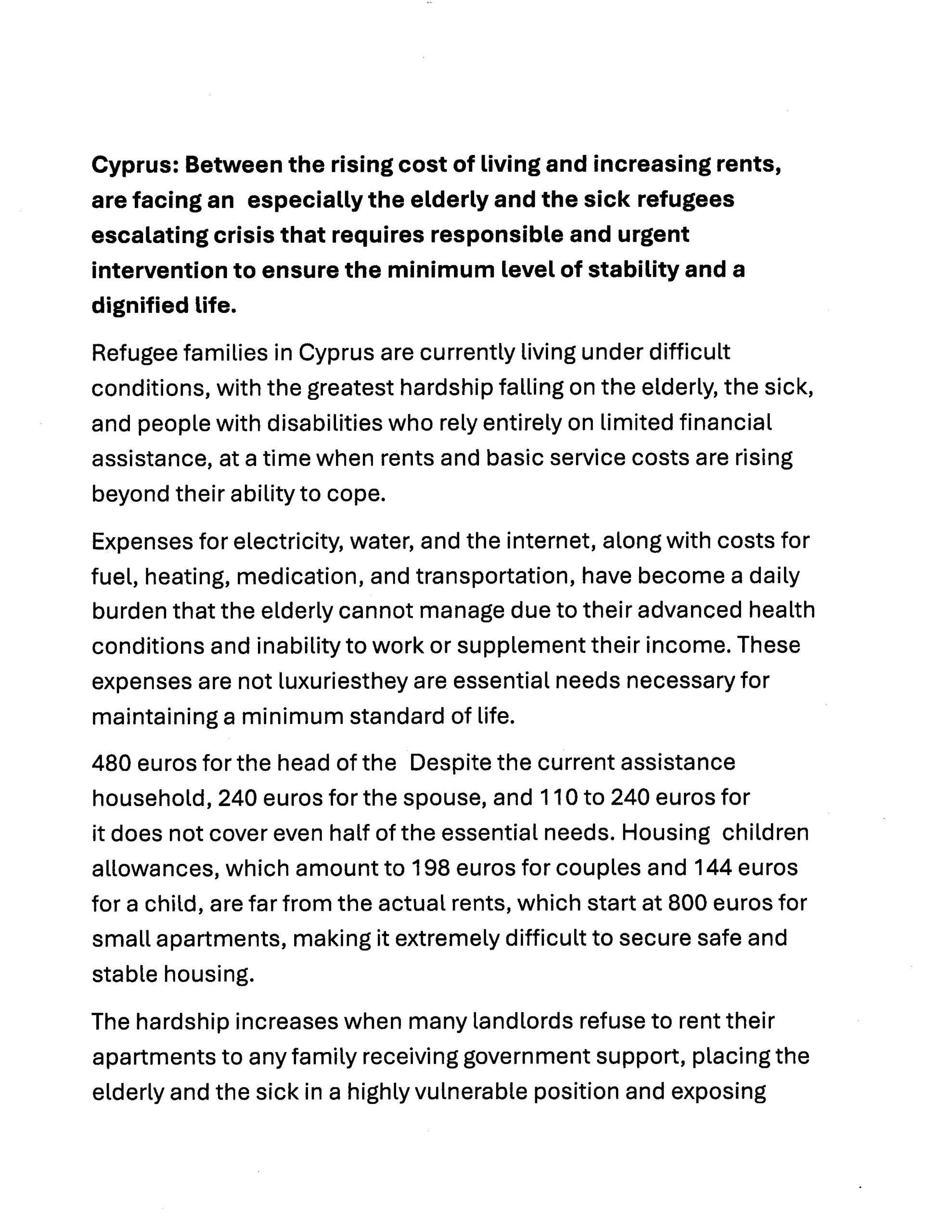 قبرص: بين غلاء المعيشة وارتفاع الإيجارات، اللاجئون وخاصة كبار السن والمرضى يواجهون أزمة متصاعدة تستدعي تدخّلًا مسؤولًا وعاجلًا لضمان الحد الأدنى من الاستقرار والعيش الكريم.