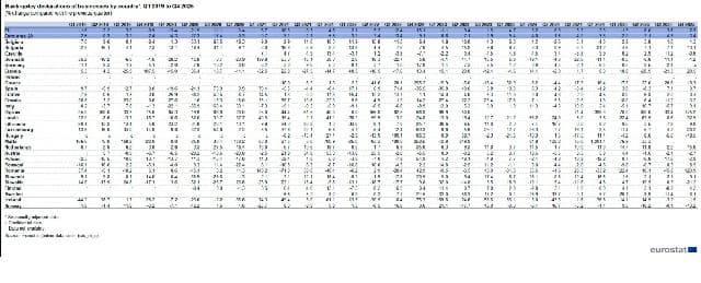 وفي الربع الثالث من عام 2025، ارتفعت طلبات الإفلاس بنسبة 3.6% في الاتحاد الأوروبي وبنسبة 4.3% في منطقة اليورو، مقارنة بالربع الثاني من عام 2025.