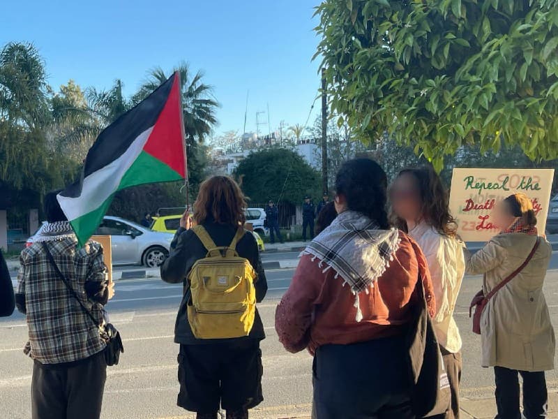 نظمت جماعة مناصرة مقرها نيقوسيا مظاهرة خارج السفارة الإسرائيلية مساء الأربعاء للاحتجاج على قانون عقوبة الإعدام الذي أقره الكنيست الإسرائيلي في 30 مارس 2026 .